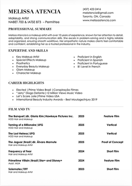Melissa Atencia is a Brazilian makeup artist working across film and television, commercials, photoshoots, and social makeup. Based in dynamic Toronto, she collaborates on engaging projects both locally and worldwide.